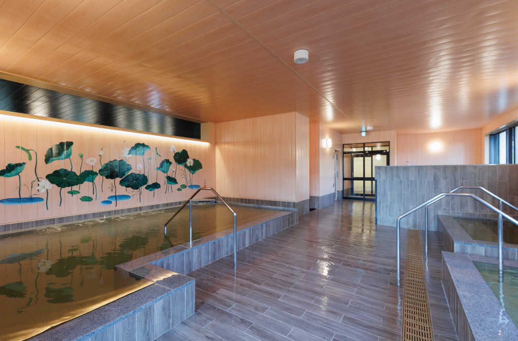 敷地内の地下1,500メートルから湧き出る天然温泉は、まさに自然の恵み。源泉55℃のお湯は、ナトリウム―炭酸水素塩・塩化物泉で、しっとりすべすべとした湯ざわりが特徴の恵まれた泉質です。極上の天然湯に浸り、ゆったりのんびりとおくつろぎください。